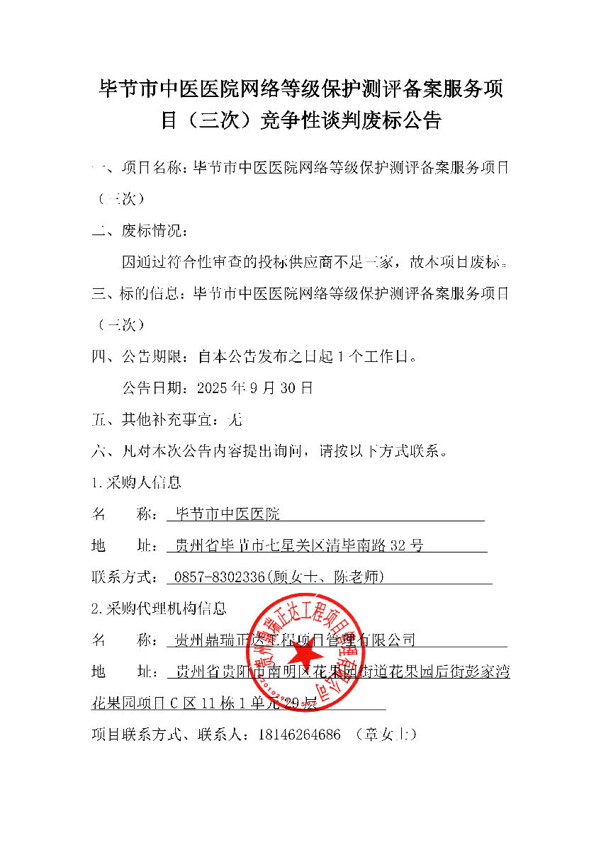 毕节市中医医院网络等级保护测评备案服务项 目(三次)竞争性谈判废标公告
