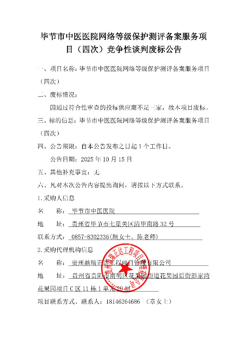 毕节市中医医院网络等级保护测评备案服务项目(四次)竞争性谈判废标公告