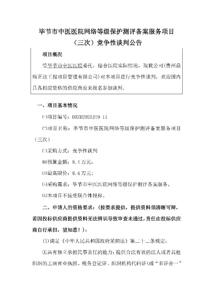 毕节市中医医院网络等级保护测评备案服务项目 (三次)竞争性谈判公告