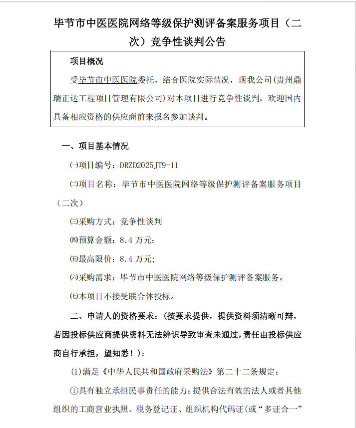 毕节市中医医院网络等级保护测评备案服务项目(二 次)竞争性谈判公告