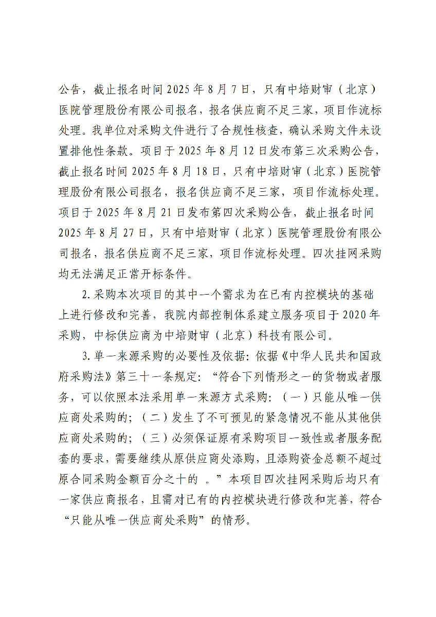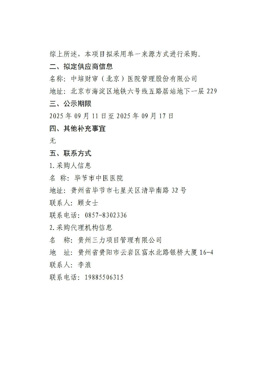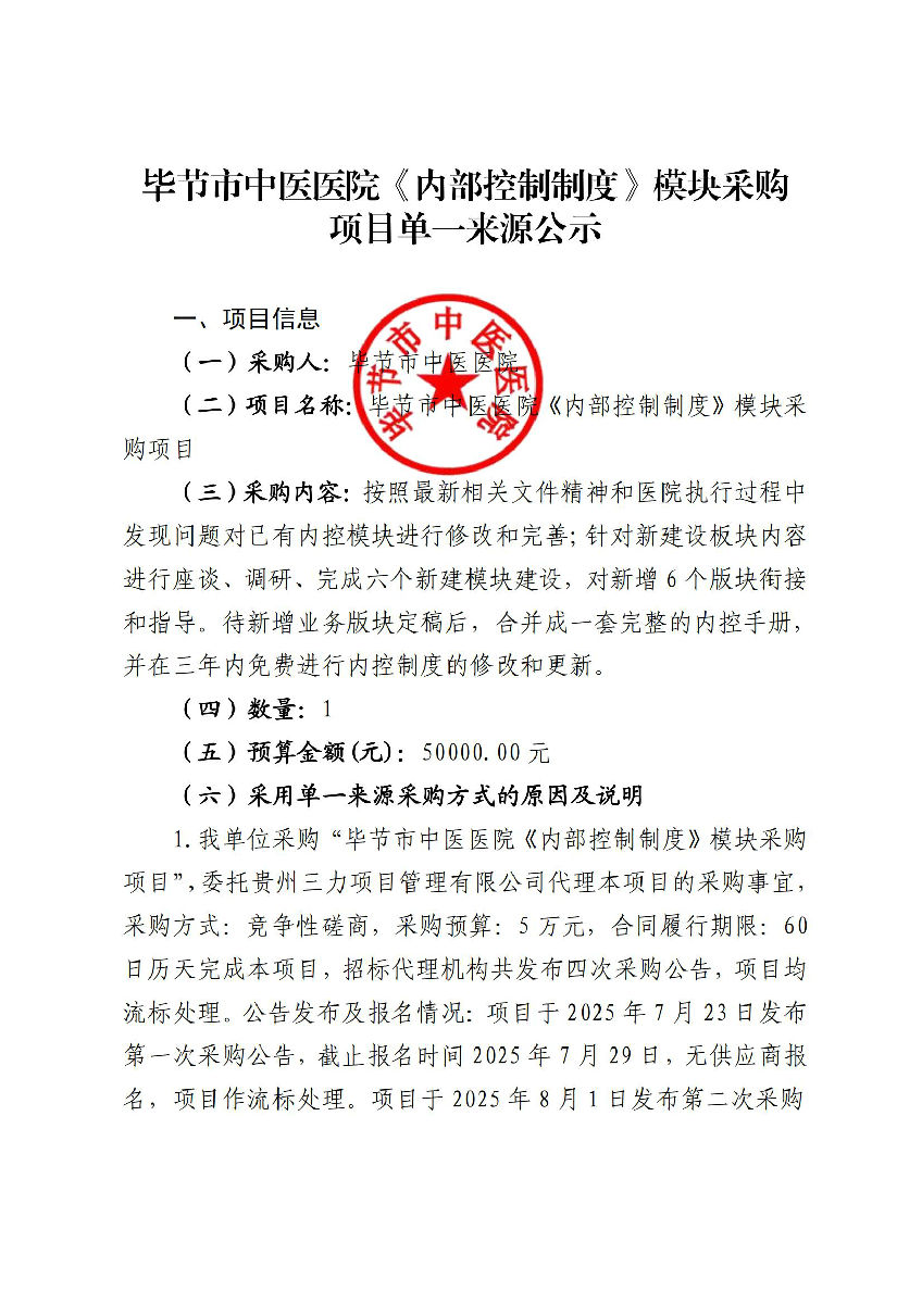 毕节市中医医院《内部控制制度》模块采购 项目单一来源公示