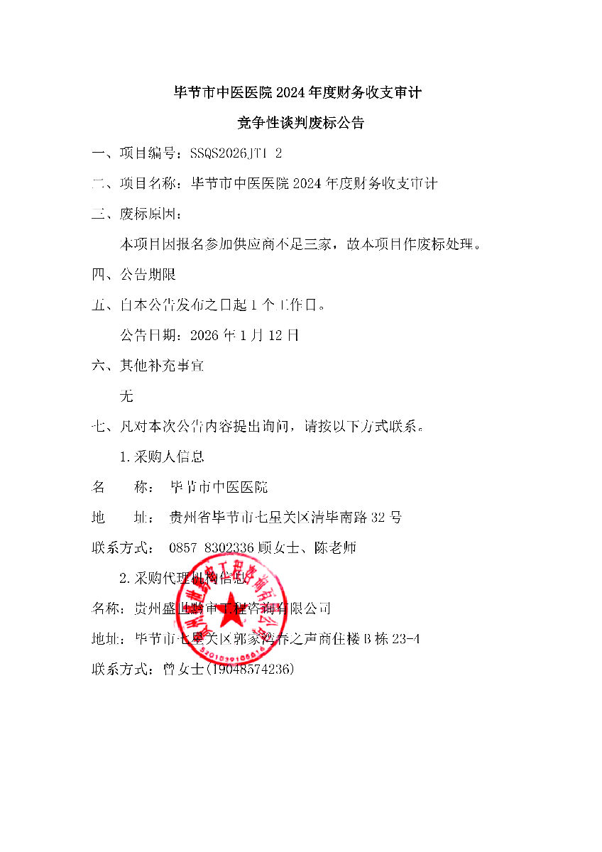 毕节市中医医院2024年度财务收支审计竞争性谈判废标公告